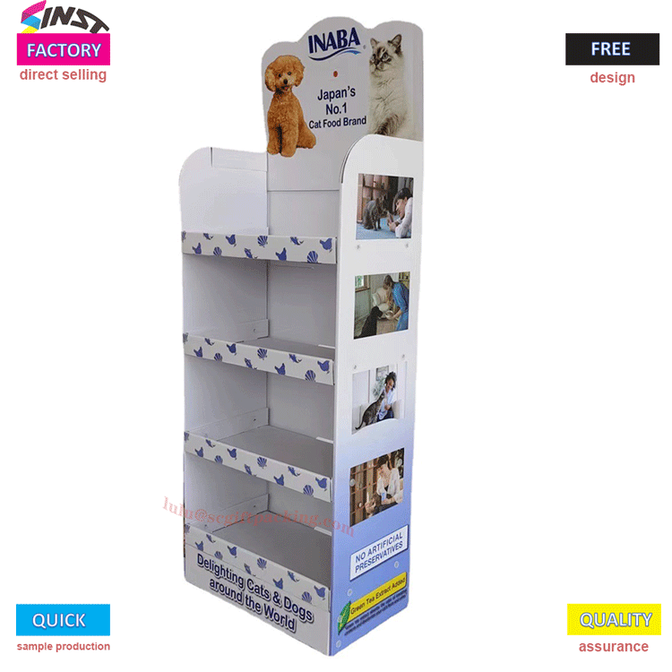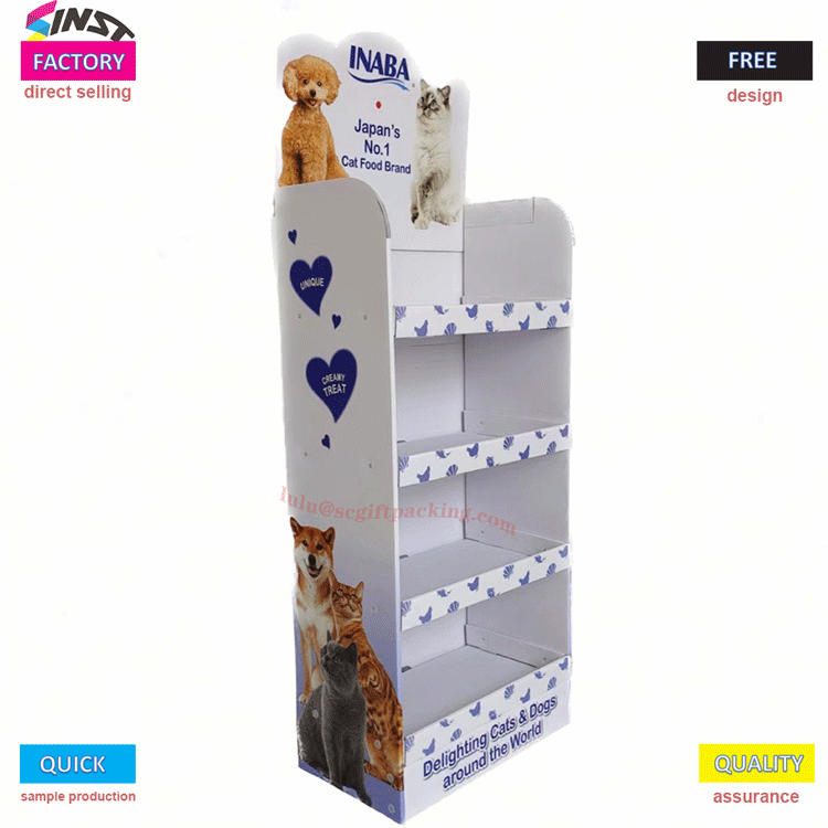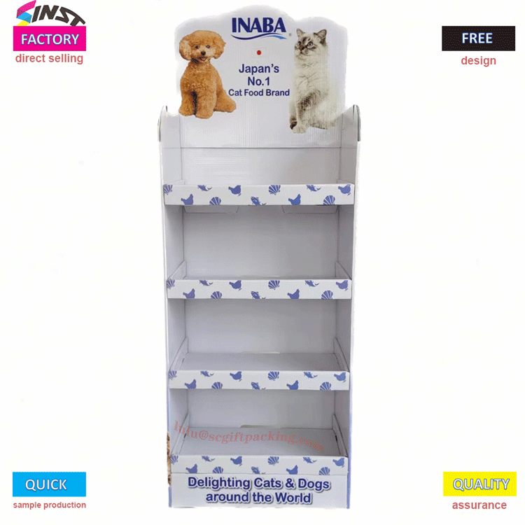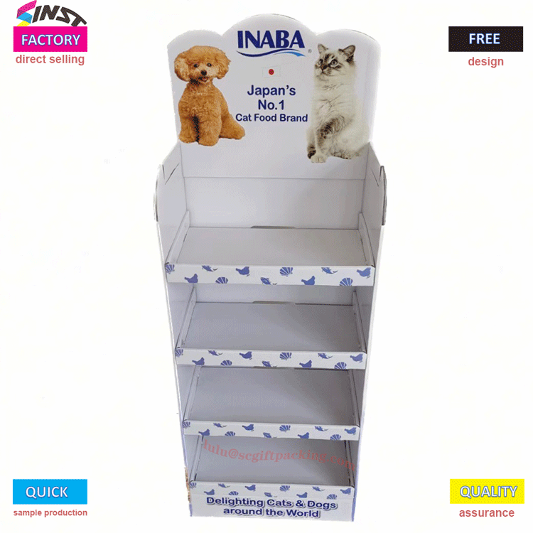 Maskoten elikagaien hornikuntzarako kartoizko erakusleiho tolesgarria ingurumena errespetatzen duten materialez egina dago, sendoak eta iraunkorrak. Tamaina egokitu dezakezu maskoten elikagaien zehaztapen desberdinak eroso erakusteko. Muntatzeko eta desmuntatzeko erraza, garraiatzeko eta biltegiratzeko erosoa. Geruzadun diseinu bereziak animalien janaria erakustea antolatu eta erosoagoa egiten du bezeroek aukeratzeko.