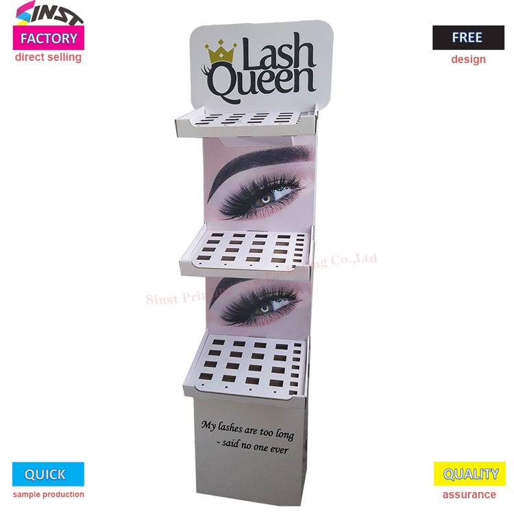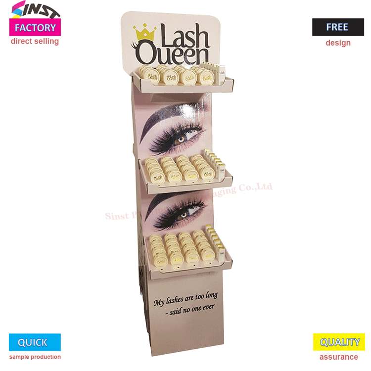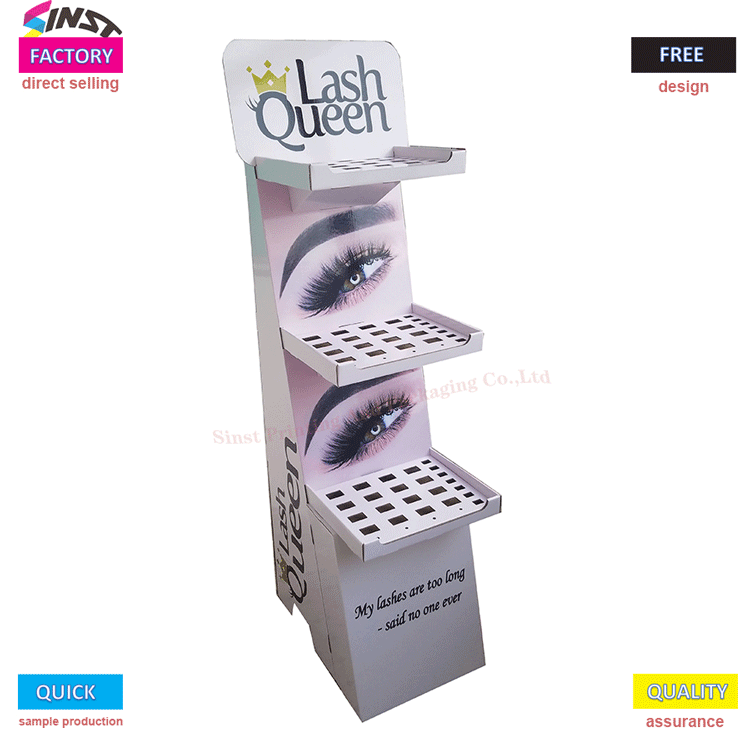 SINST Mascara Betile faltsuak Betazalen bikoitzeko adabakietarako solairuko erakusleihoa betile faltsuen produktuak bistaratu, erakutsi eta saltzera zuzendutako erakusleiho bat da. Erakusleihoa kartoizkoa da, eta material nagusiak kalitate handiko kartoia, kartoi korrugatua eta abar dira. Mascara diseinuaren egitura, oro har, hiru geruzatan banatzen da, eta bistaratze apalategiaren tamaina, oro har, mascara produktuaren tamainarekin bat dator. eta tamaina produktu kopuruaren eta erakutsi behar den espazioaren tamainaren arabera diseinatu daiteke. Mascara begi-itzalen pantailak diseinu-estilo ezberdinetan daude eskuragarri, diseinu-estiloa, kolorea eta elementu kulturalak marka-irudiaren, produktuaren ezaugarrien, merkatuko ikusleen, urtaro-aldaketen eta abarren arabera aukeratzeko aukera ematen dizute, inpresio iraunkorra egiteko.