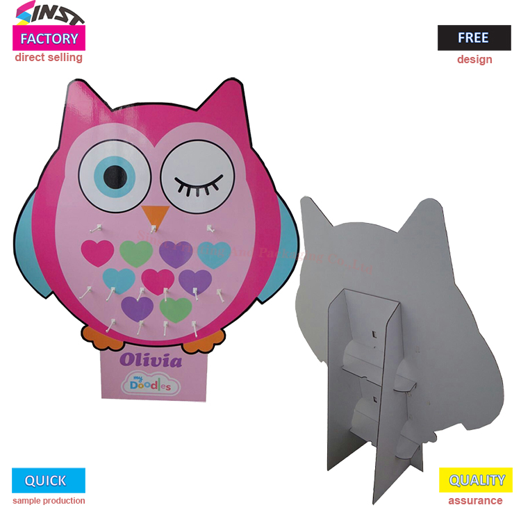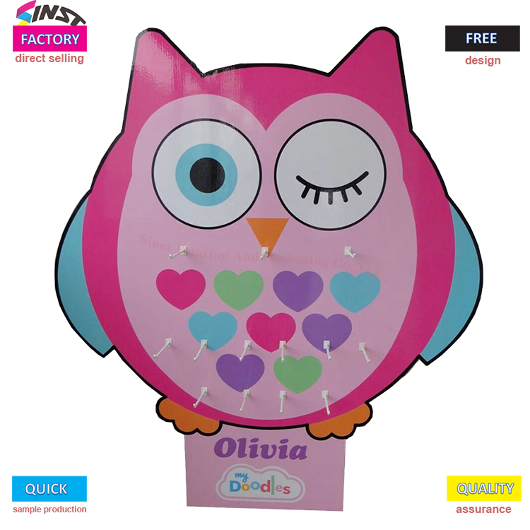 3. Produktuaren ezaugarriak: Owl Peg Kartoizko erakusleihoa Jostailu poltsa Keychain Papereria Kakoekin publizitate-eramaile bikaina da, publizitate eta produktuen salmentaren funtzioak lortzen ditu, bistaratzeko asmoak eraginkortasunez transmititzen ditu eta produktuen salmentak areagotzen ditu. Gainera, erakusleihoak itxura ederra du, egitura sendoa, berdindu eta pilatu daiteke, eramateko erraza da, muntatu eta desmuntatu daiteke, garraiatzeko azkarra eta erosoa da, behin eta berriz erabil daiteke eta kostuak aurrezten ditu.