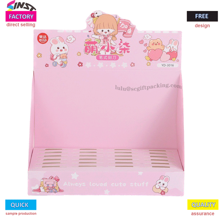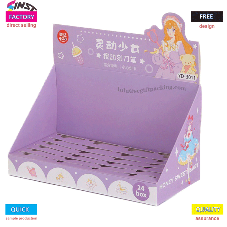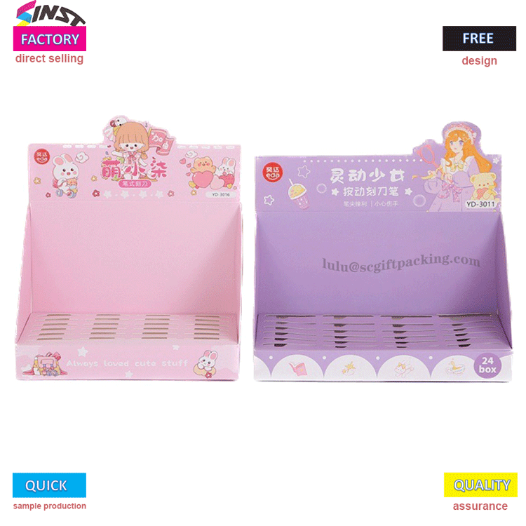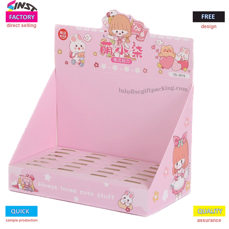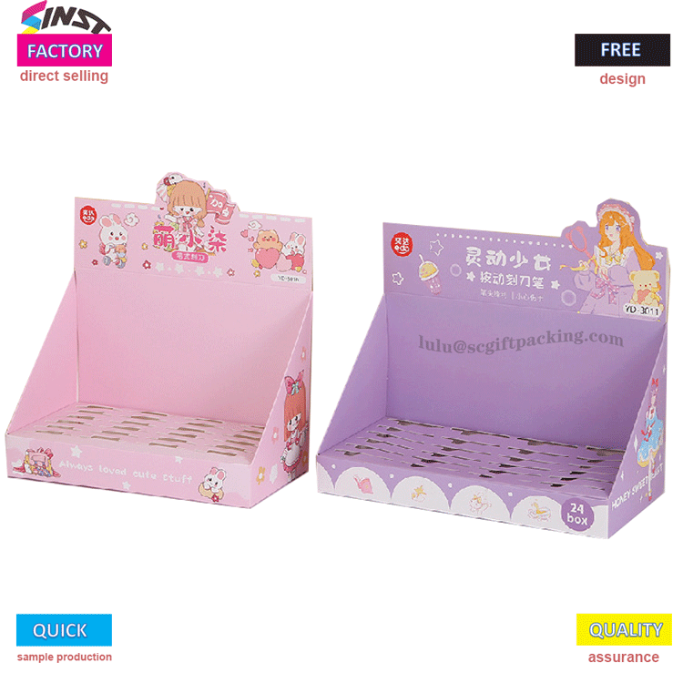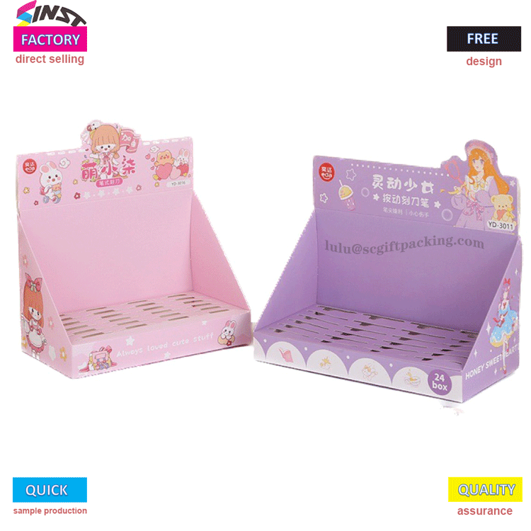 Supermerkatuko arkatz mahaigaineko kartoizko erakusleiho hau kartoizko material sendo, iraunkor eta ingurumena errespetatzen duena da. Bere diseinu sinple eta dotorea ezin hobeto molda daiteke mahaigaineko hainbat ingurunetara. Zulo itxurako diseinu bereziak ur-oinarritutako boligrafoen pantaila sendoagoa eskaintzen du, bezeroei begirada batean argi utziz. Erakusleihoak egitura egonkorra du, hainbat boligrafo erraz eraman ditzake eta erraz jaso daiteke. Produktuak modu eraginkorrean bistaratzeaz gain, enpresek uretan oinarritutako boligrafoak erakusteko aukera ezin hobea da, salmentei laguntza gehituz eta estetikaren eta praktikotasunaren konbinazio ezin hobea lortuz.
