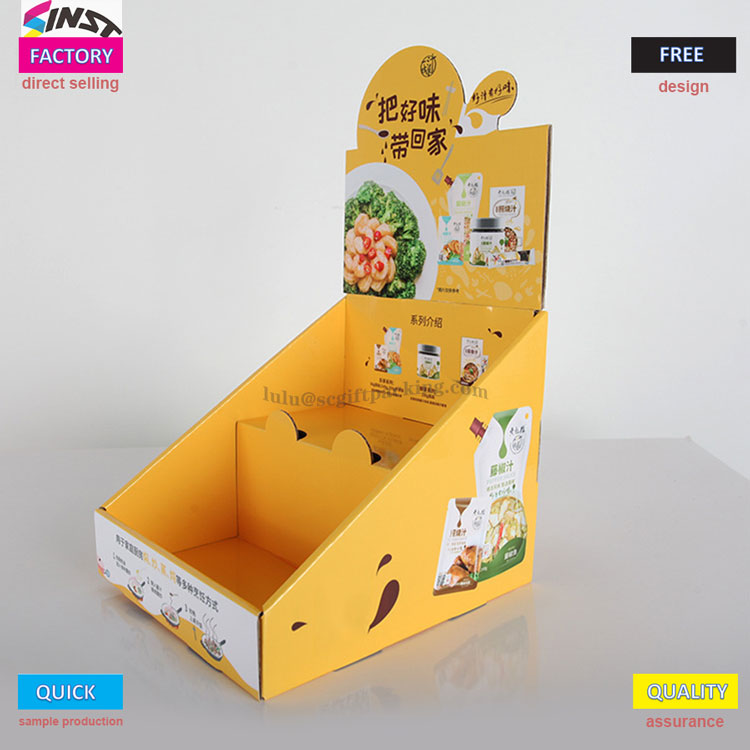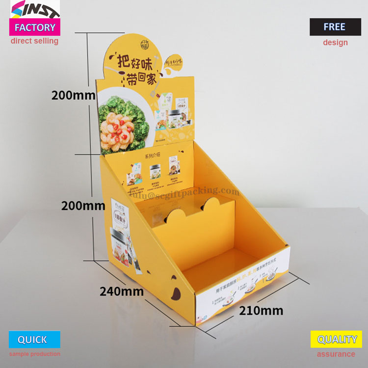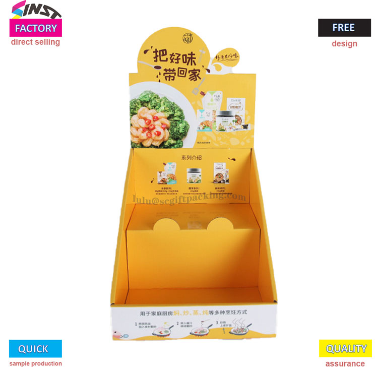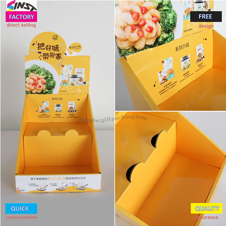 Hau da, supermerkatua CountTop kartoizko pantailako kutxa, piper bistaratzeko kutxa, gatz erakusleiho bat izan daiteke, oilaskoaren esentzia bistaratzeko laukia eta abar. Batez ere kolore horia distiratsua da eta kontrako tresna bihurtu da kontagailuaren pantailarako.